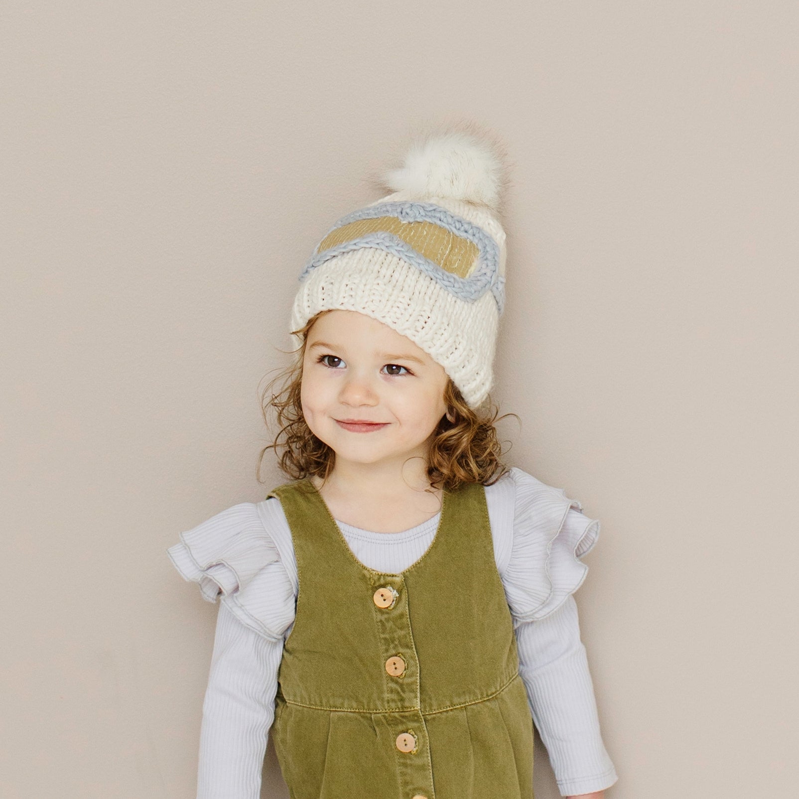 The perfect beanie for little skiers and snowboarders. Our Cream Ski Hat with Bowie Grey Goggles is the perfect blend of warmth, comfort, and style, featuring a pom with gold metallic details.