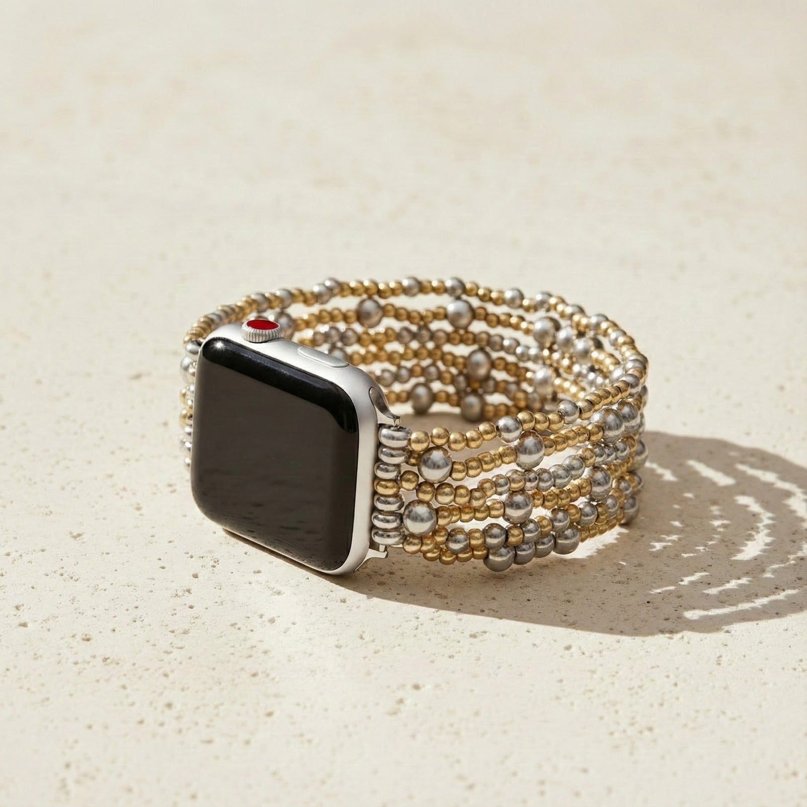 Add a hint of luxury to your wrist with the Eternal Glow Stretch Apple Watch Strap! Crafted with a stunning mix of silver and gold beads, this strap brings effortless sophistication to any look.