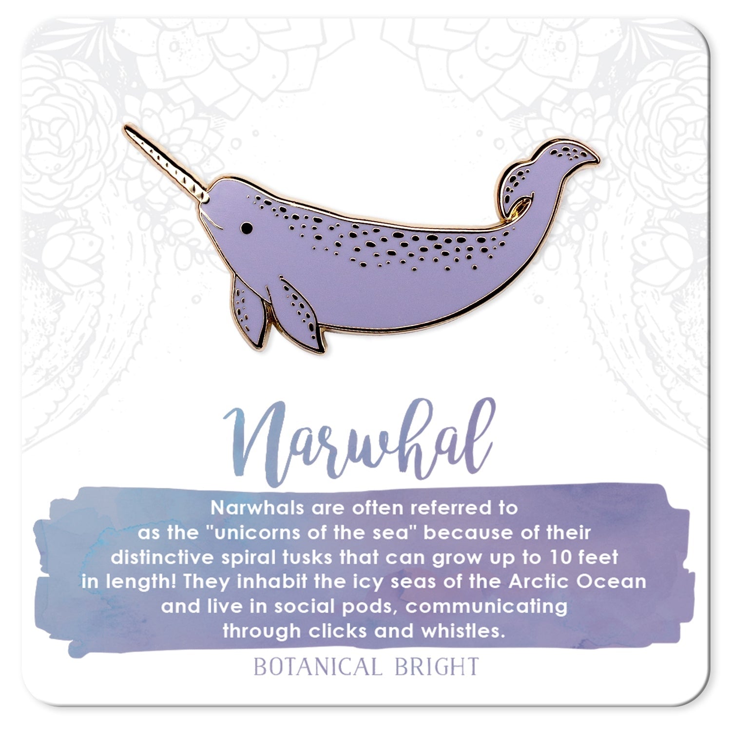 Narwhals are often referred to as the "unicorns of the sea" because of their distinctive spiral tusks that can grow up to 10 feet in length! They inhabit the icy seas of the Arctic Ocean and live in social pods, communicating through clicks and whistles. Each Pin is about 2.1" Wide with a Gold Base and is double posted. Comes packaged on it's meaning card and sleeved.